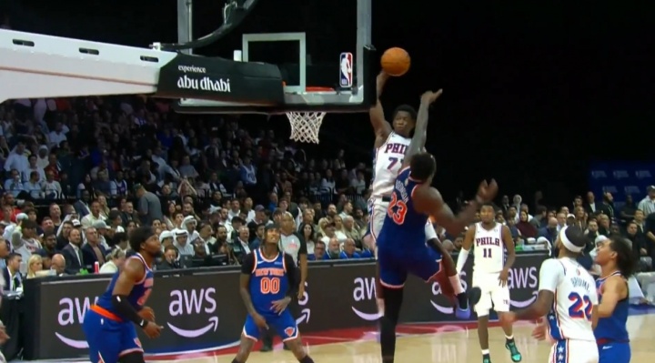 蹦得真高??76人探花埃奇庫(kù)姆起飛 隔扣米切羅沒(méi)成功但造成犯規(guī)